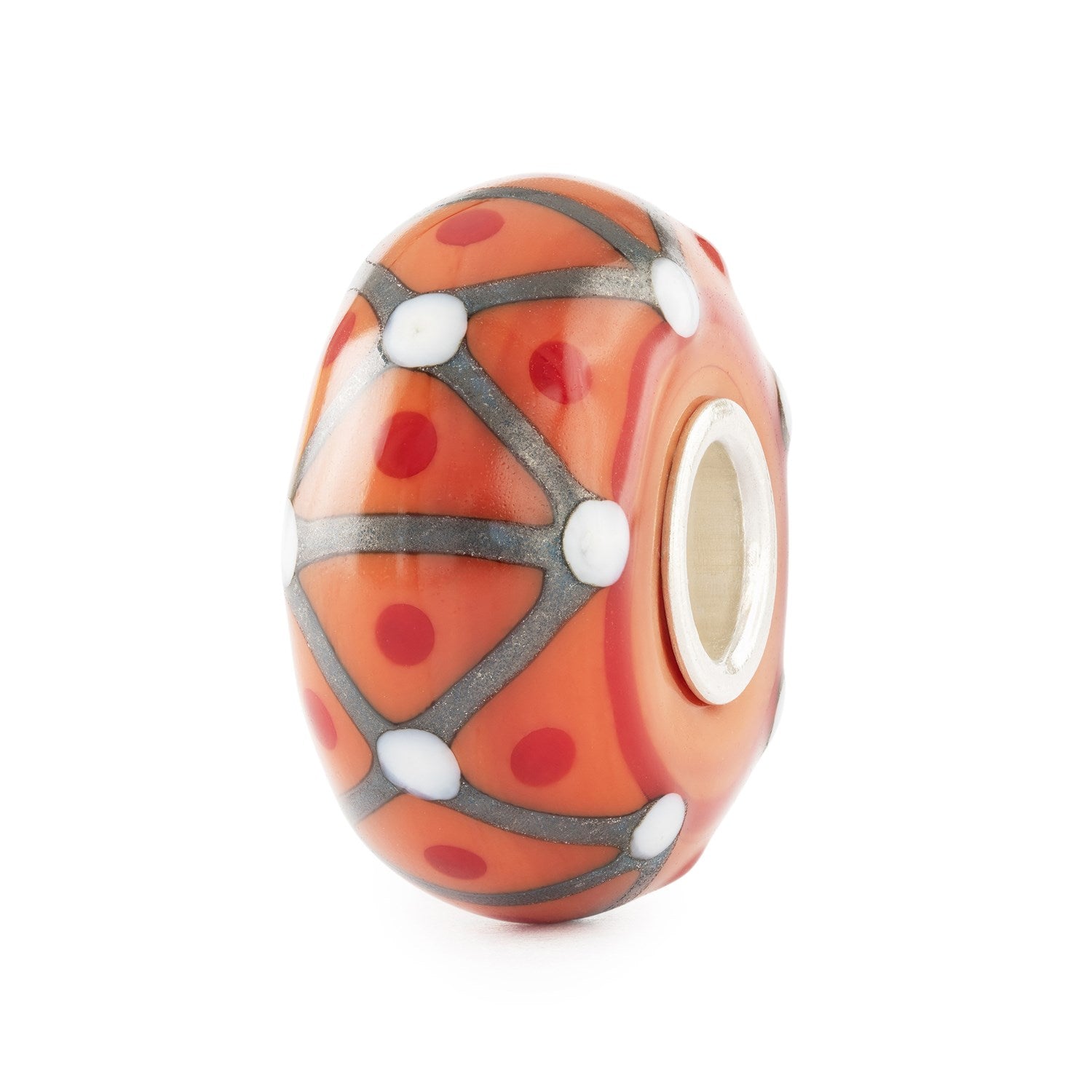 このガラスビーズは、クラシックなフォルムと滑らかな表面を持ち、細部にまでこだわった美しさが際立ちます。深みのある赤錆色の背景に、赤と白のドット、そして銀灰色のラインが繊細にあしらわれ、シンプルでありながら驚くほど精緻な印象を与えます。スターリングシルバーの芯が洗練された輝きを添え、時を超えて愛される美しさを宿しています。
